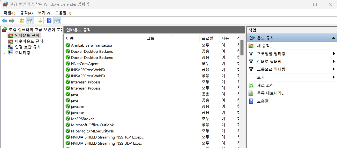 좌측의 인바운드 규칙을 클릭 후, 우측의 새 규칙 을 클릭