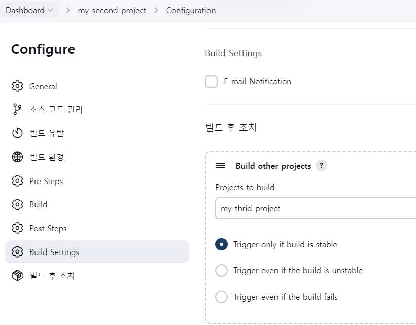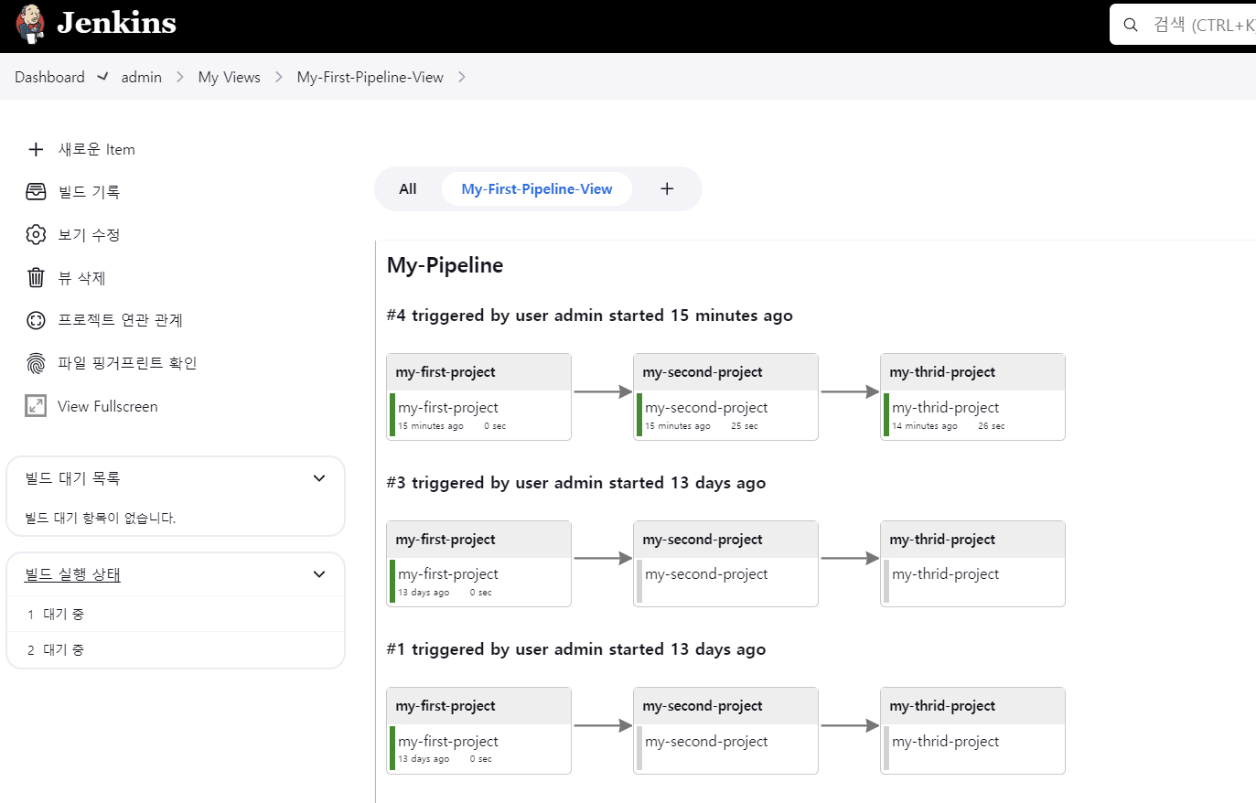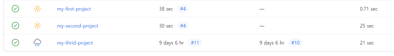 대시보드에 존재하는 my-first-project, second, third가 순차적이고 성공적으로 빌드되는 환경부터