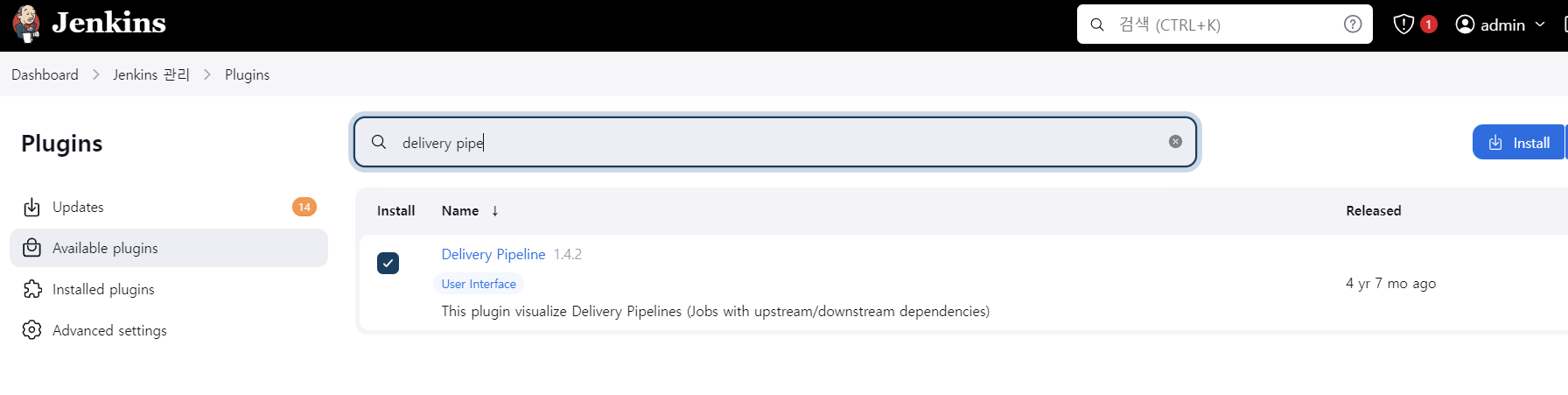 이제 이 파이프라인을 시각화 하기 위해, Delivery Pipeline을 설치한다.