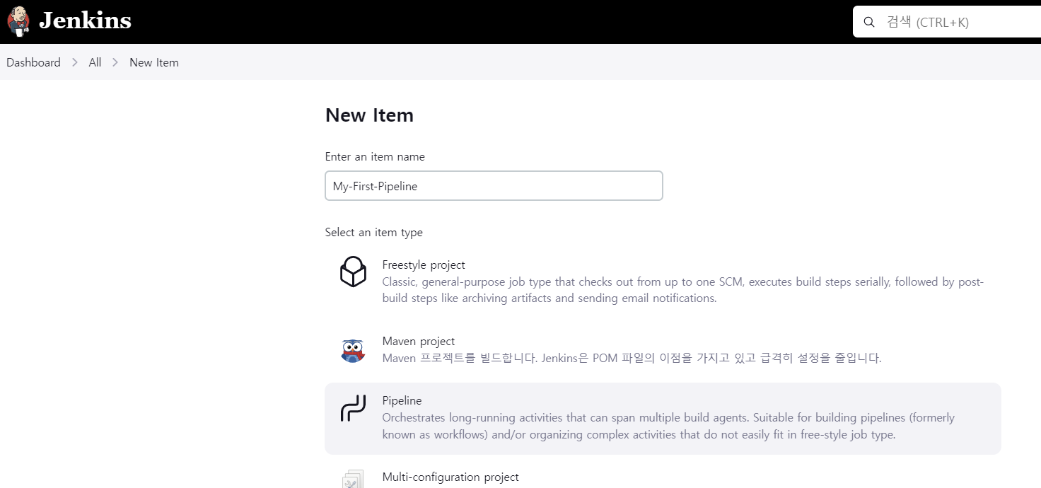 Item생성 시, type을 Pipeline으로 지정해준다.