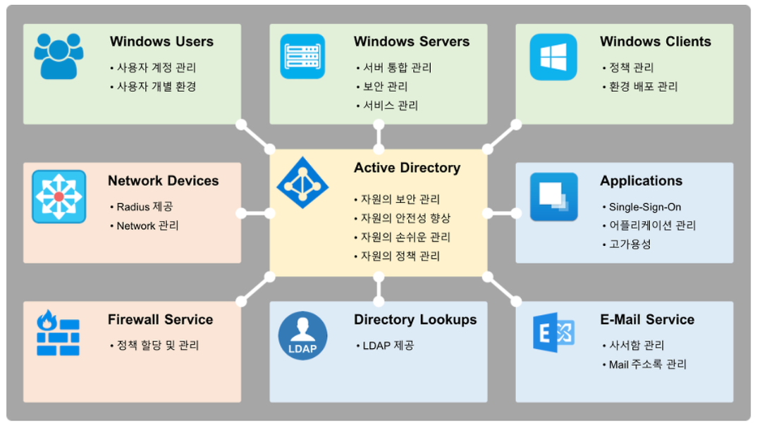즉 Active Directory는 기업 환경에서 다수 자원과 정보를 통합하여 관리하기 위해 사용하는 디렉터리 서비스이다.