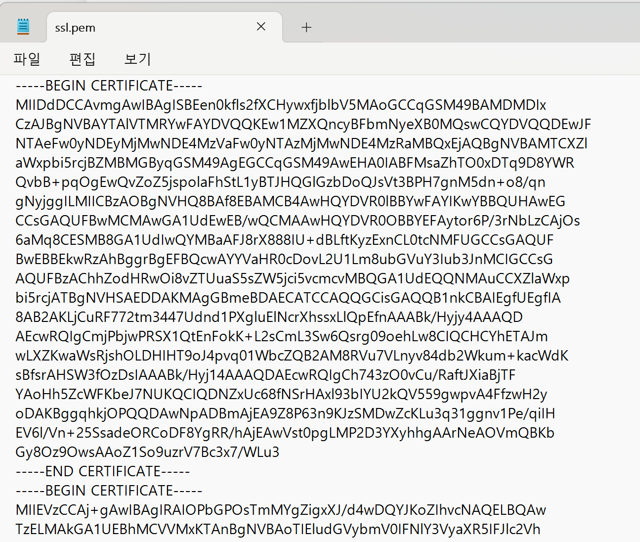 - 복사한 인증서 체인을 메모장 등 텍스트 편집기에 붙여넣고 파일 확장자를 .pem으로 저장 예: